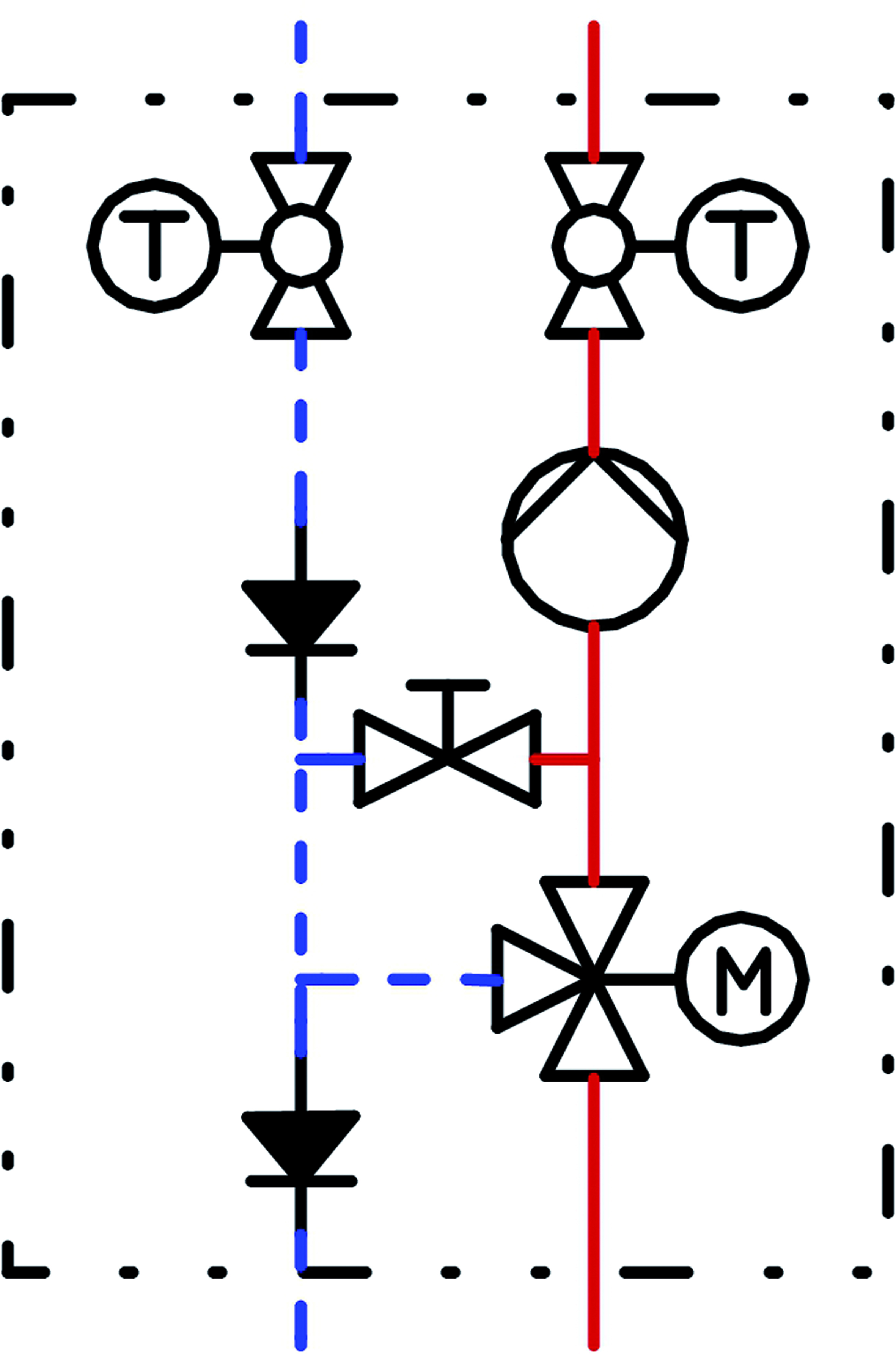 komplett aus Messing, lineare Kennlinie (verhindert ein Aufschwingen der Regelung). Über den von vorn einstellbaren Bypass werden 0-50% Rücklaufwasseranteil (anlagenabhängig) aus dem Heizkreis dem Vorlauf beigemischt.