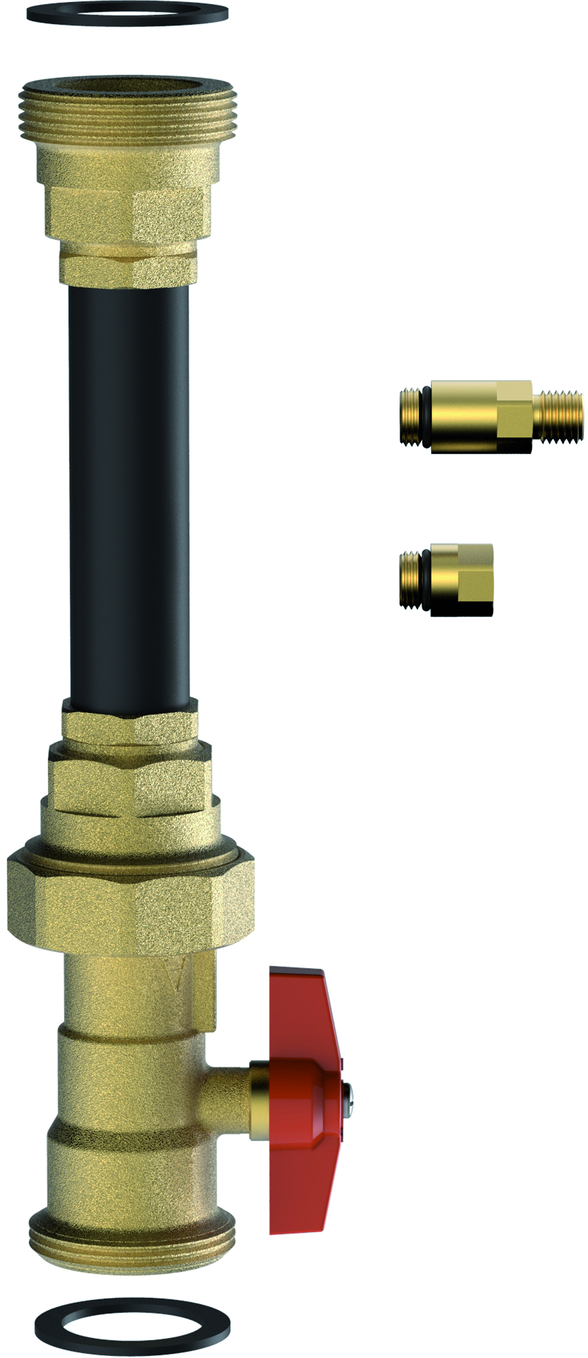 Bestehend aus: flachdichtenden Verschraubungsteilen, 1 Passrohr, Dichtungen, 1 Pumpenkugelhahn mit Schwerkraftbremse und Überwurfmutter.