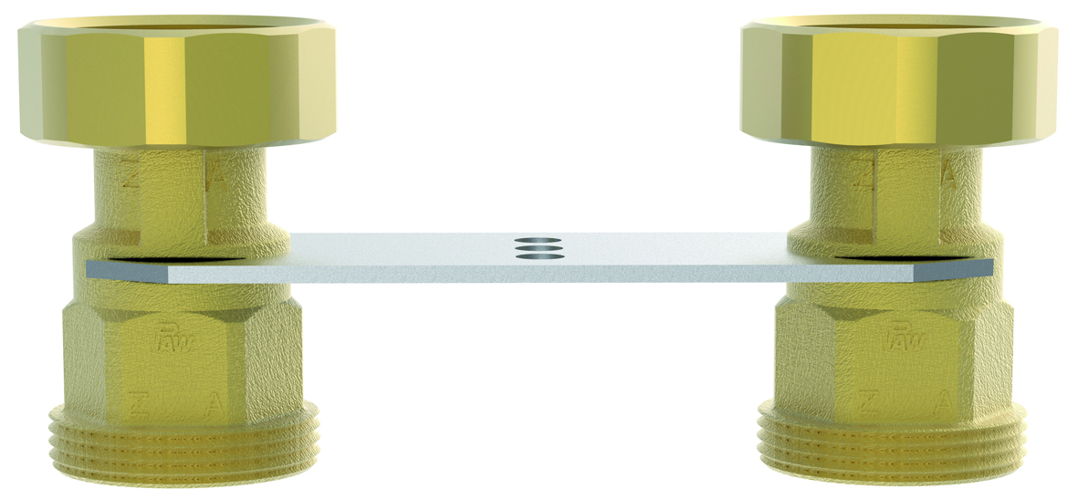 Bestandteile: Halteplatte, 2 Dichtungen, 2 x 1½" Mutter, 2 x Kupplungsgehäuse F 1" x 1½" AG
