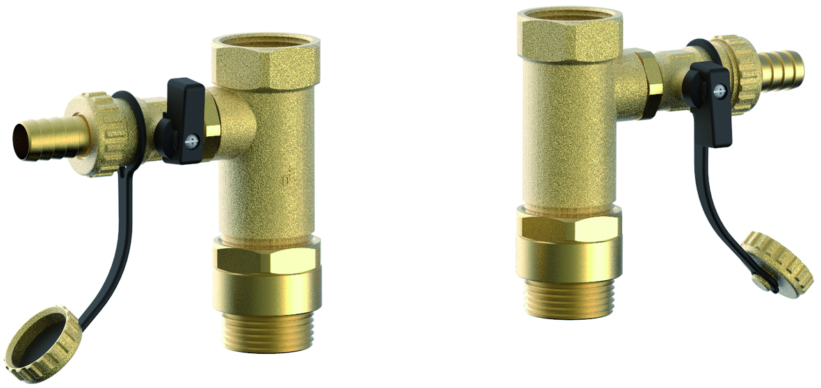 2 x Konter-T-Stück 1" AG x 1" IG mit KFE-Hahn, je mit Hahnverlängerung, ermöglicht das Spülen und Entleeren einzelner HeatBloC®s.