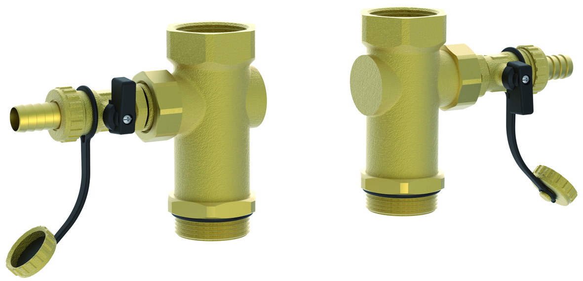 2 x Konter-T-Stück 1¼" mit KFE-Hahn, je mit Hahnverlängerung, ermöglicht das Spülen und Entleeren einzelner HeatBloC®s.