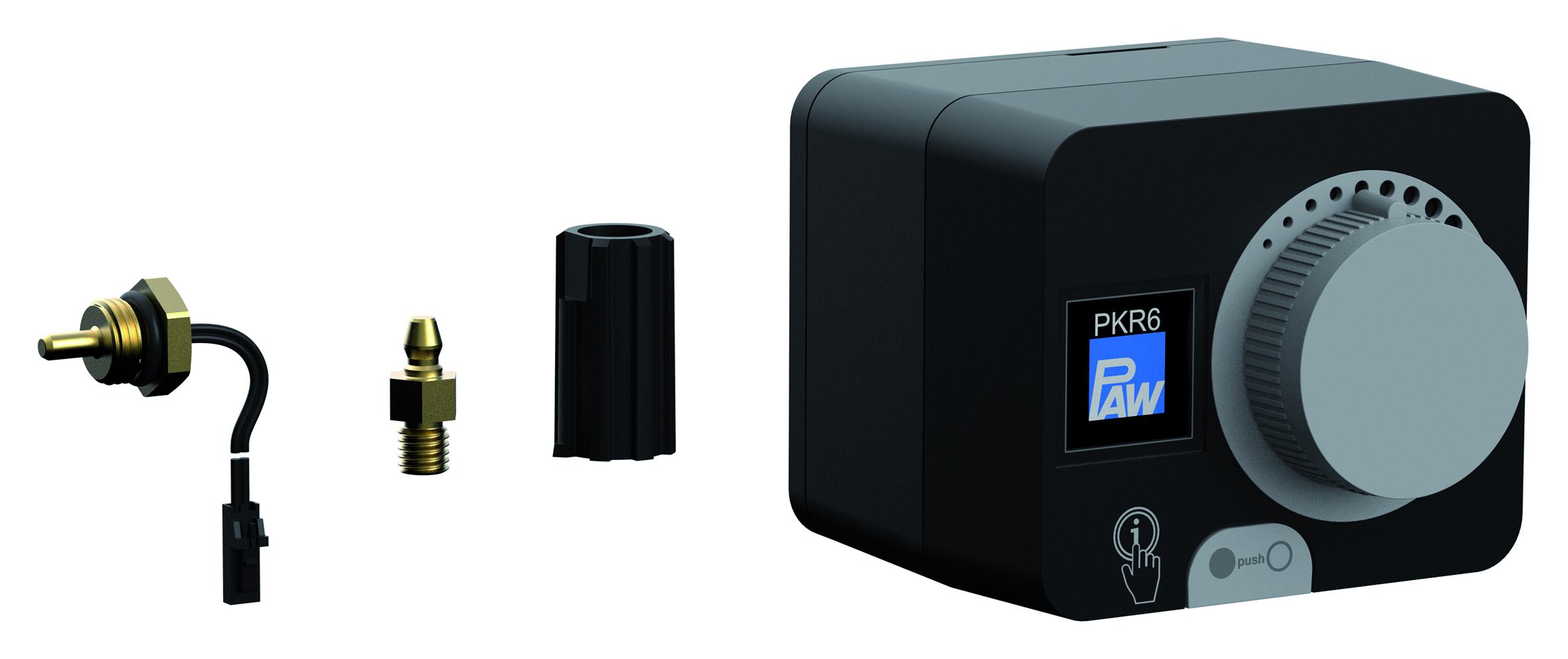 inkl. Anbausatz für Rastmontage am PAW-Mischer und PT-1000-Einschraubfühler G¼" für den Vorlauf-Kugelhahn, Umschalter für Hand-/Automatikbetrieb,