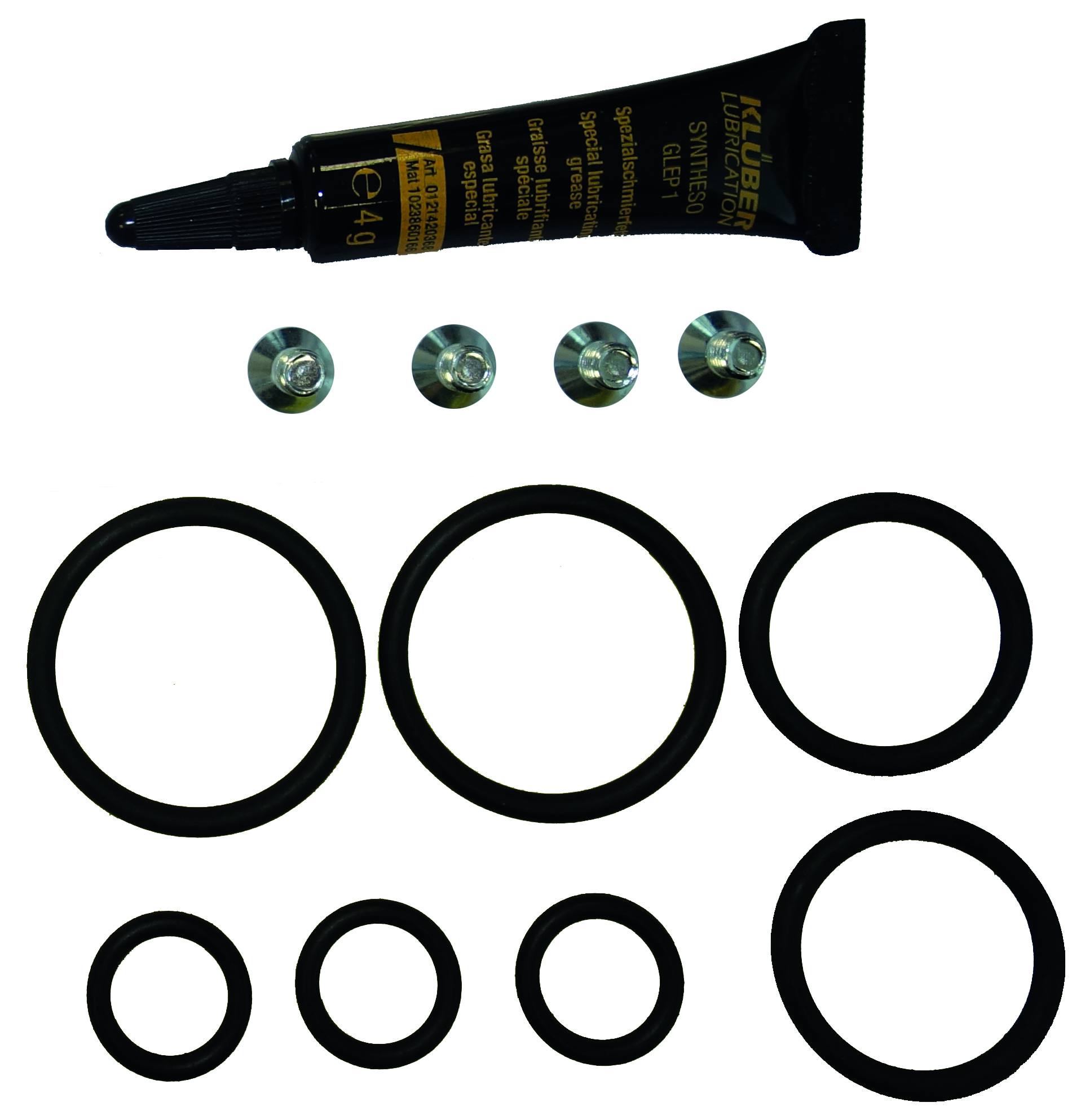 Bestandteile: O-Ringe, Senkschrauben mit Kreuzschlitz, Tube Fett für O-Ringe (Synteso Glep1)