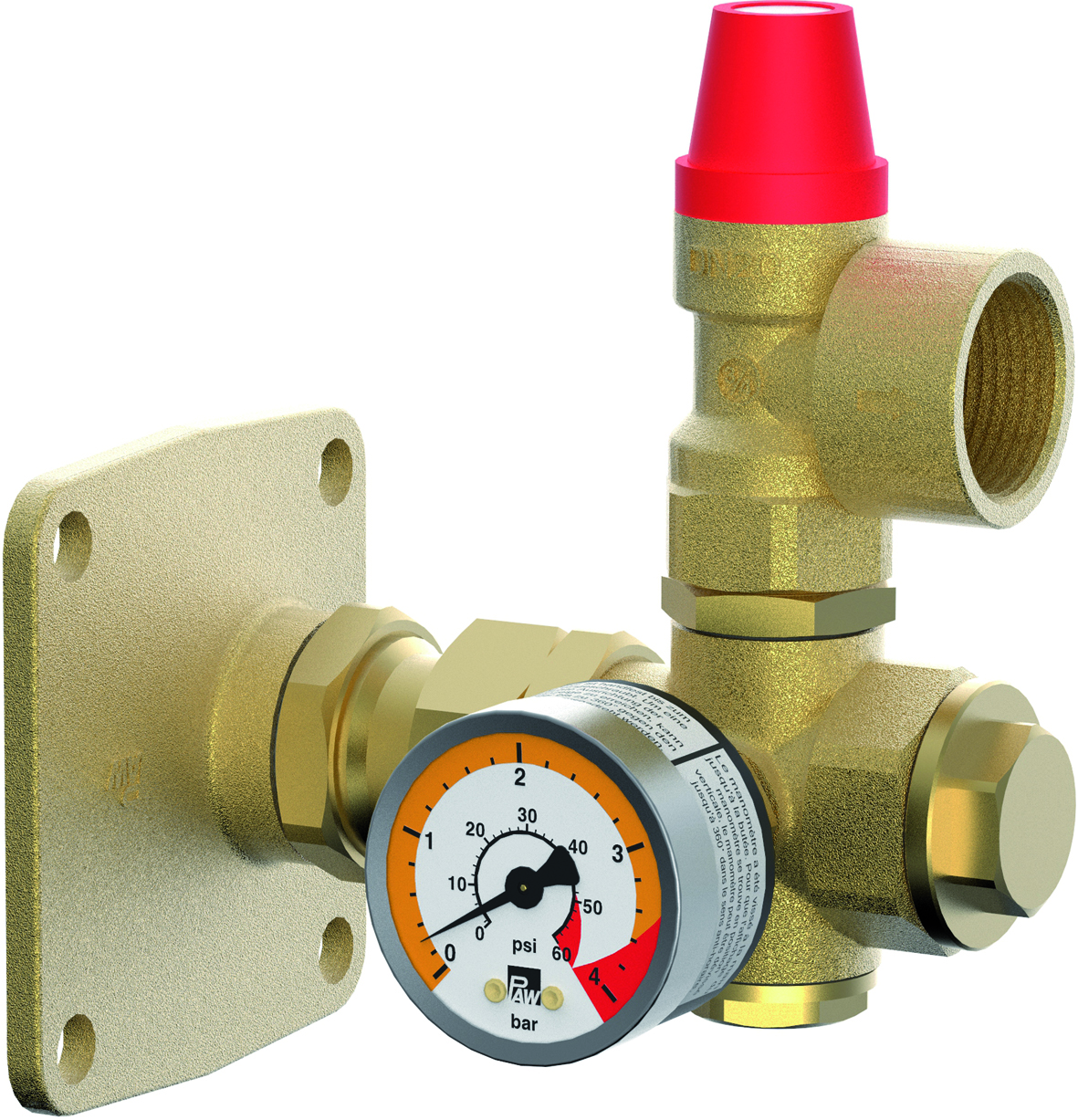 Sicherheitsventil ¾" x 1", 3 bar, bis 100 kW, Manometer 0-4 bar