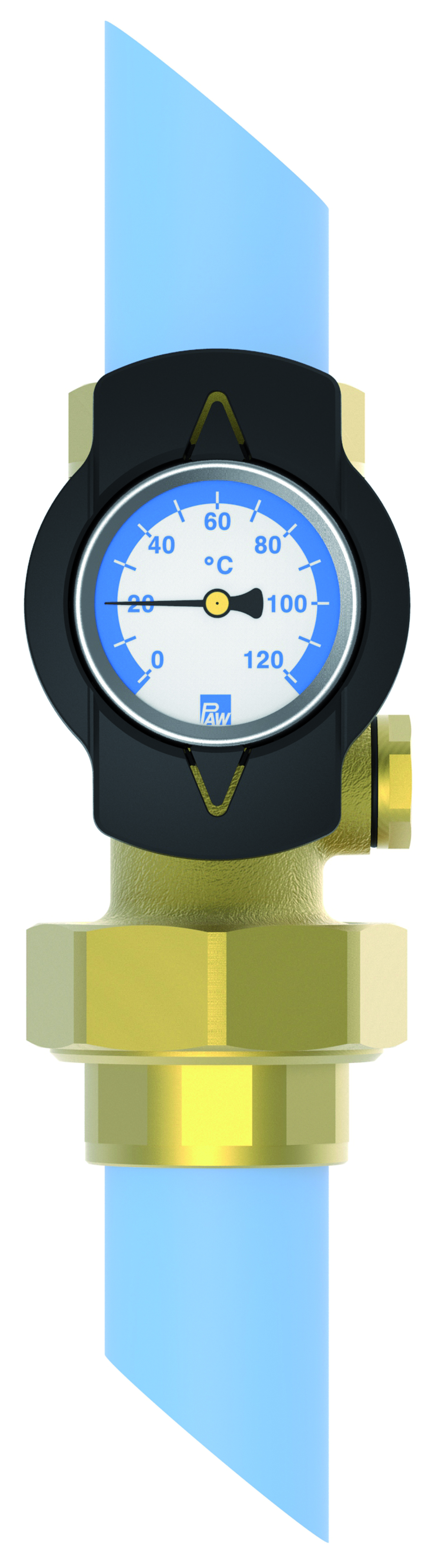 - Thermohahn mit abziehbarem Zeigerthermometer (d = 50 mm, blaue Skala) im Griff integriert