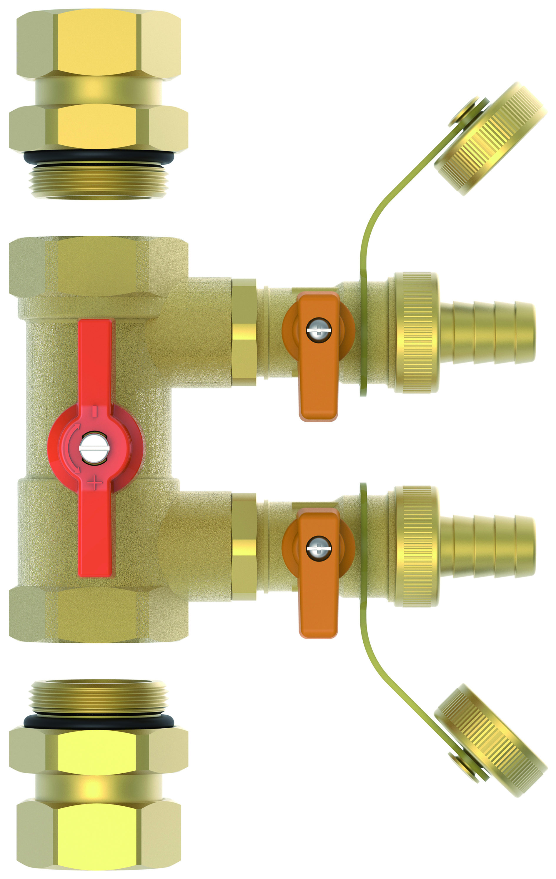 bestehend aus: Ms-Kugelhahn 1" IG , mit rotem Flügelgriff, mit 2 Abgängen ½" vor und hinter der Kugel, 2 selbstdichtenden KFE-Hähnen mit Schlauchtülle 15 mm